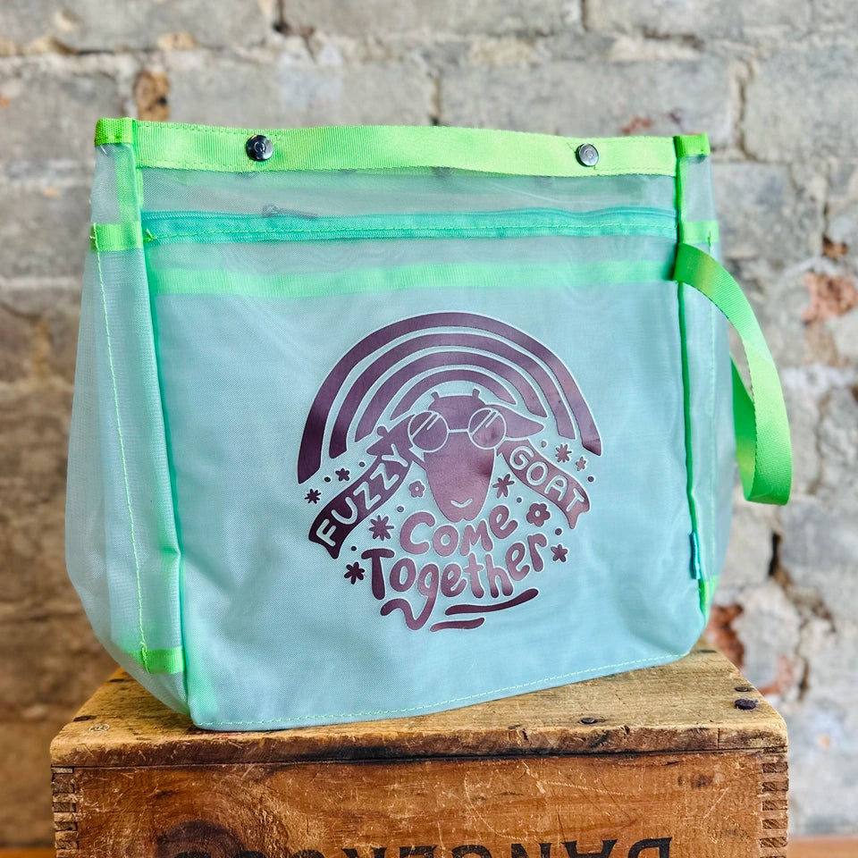The mesh material allows you to easily see your project, which is incredibly useful for colorwork. The snaps on the opening of the bag provide a snag-free environment and act as a yarn bowl of sorts because you can feed the yarn through the snaps and work out of it while on the go.