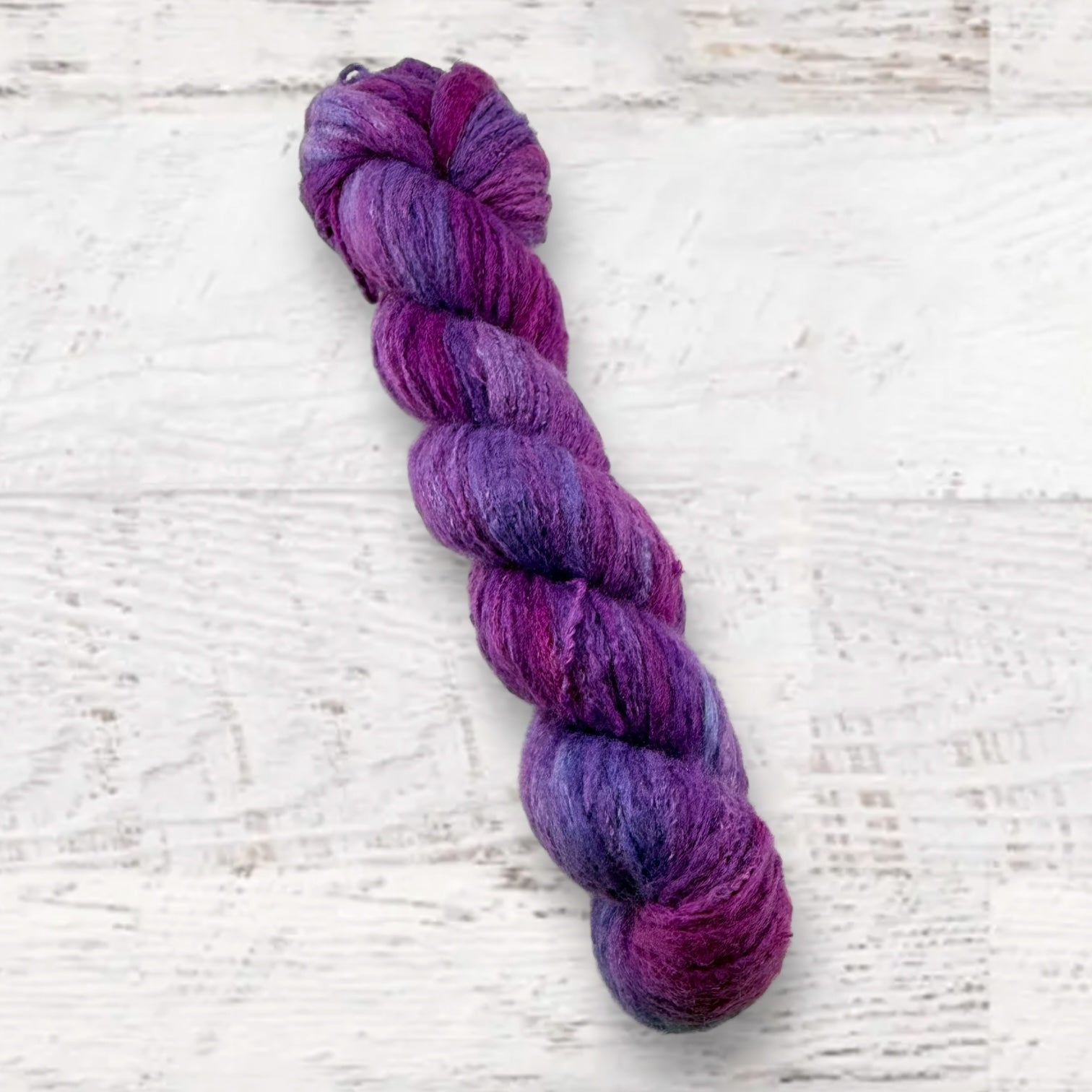 Classified as a Fingering, but it could work as a Sport and Melissa is going to try it as a DK because it is so lofty! 220 yards, 70% silk, 30% merino