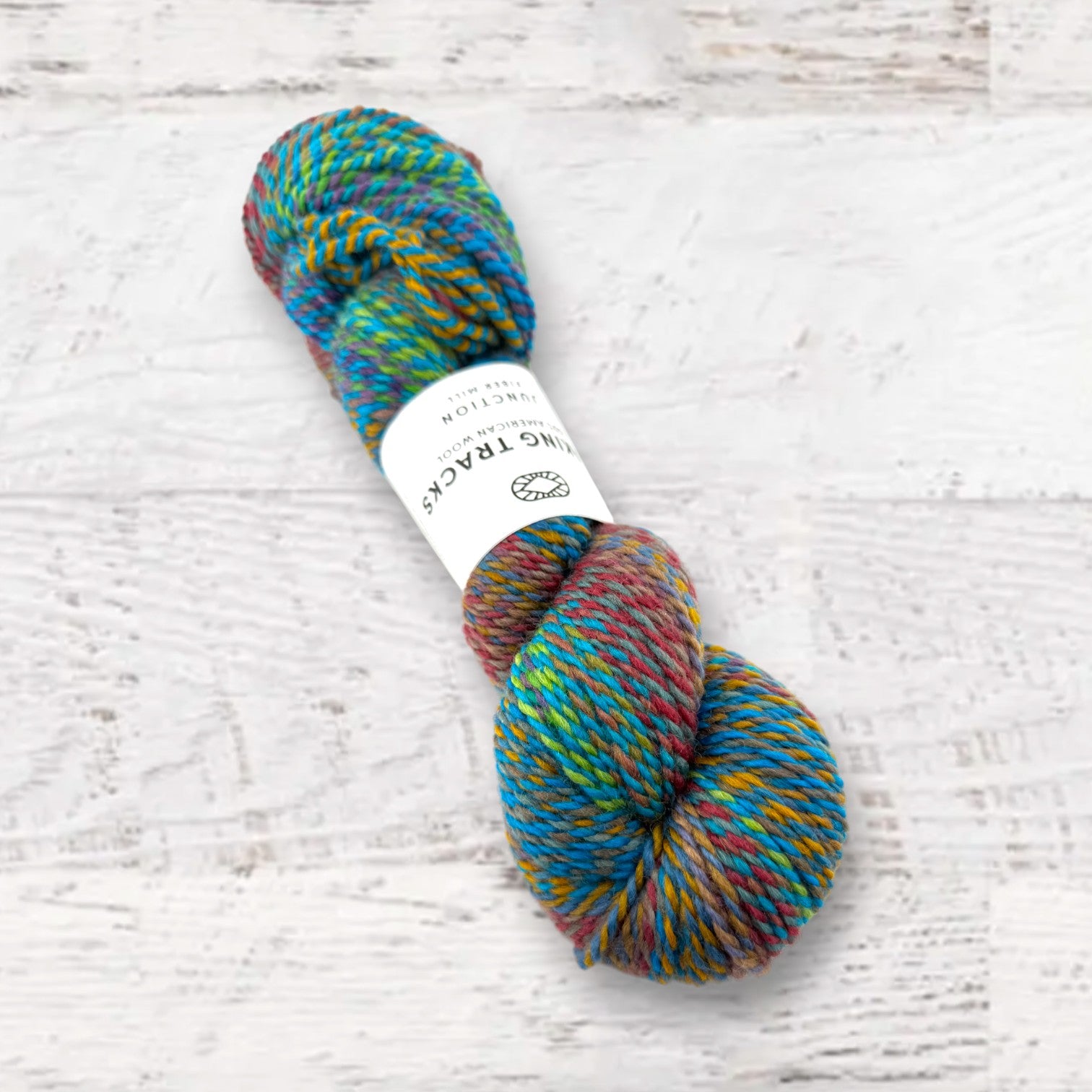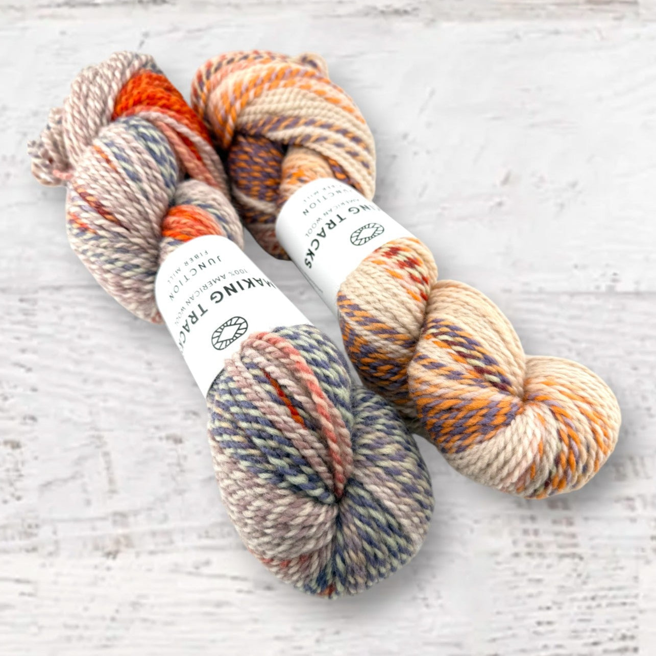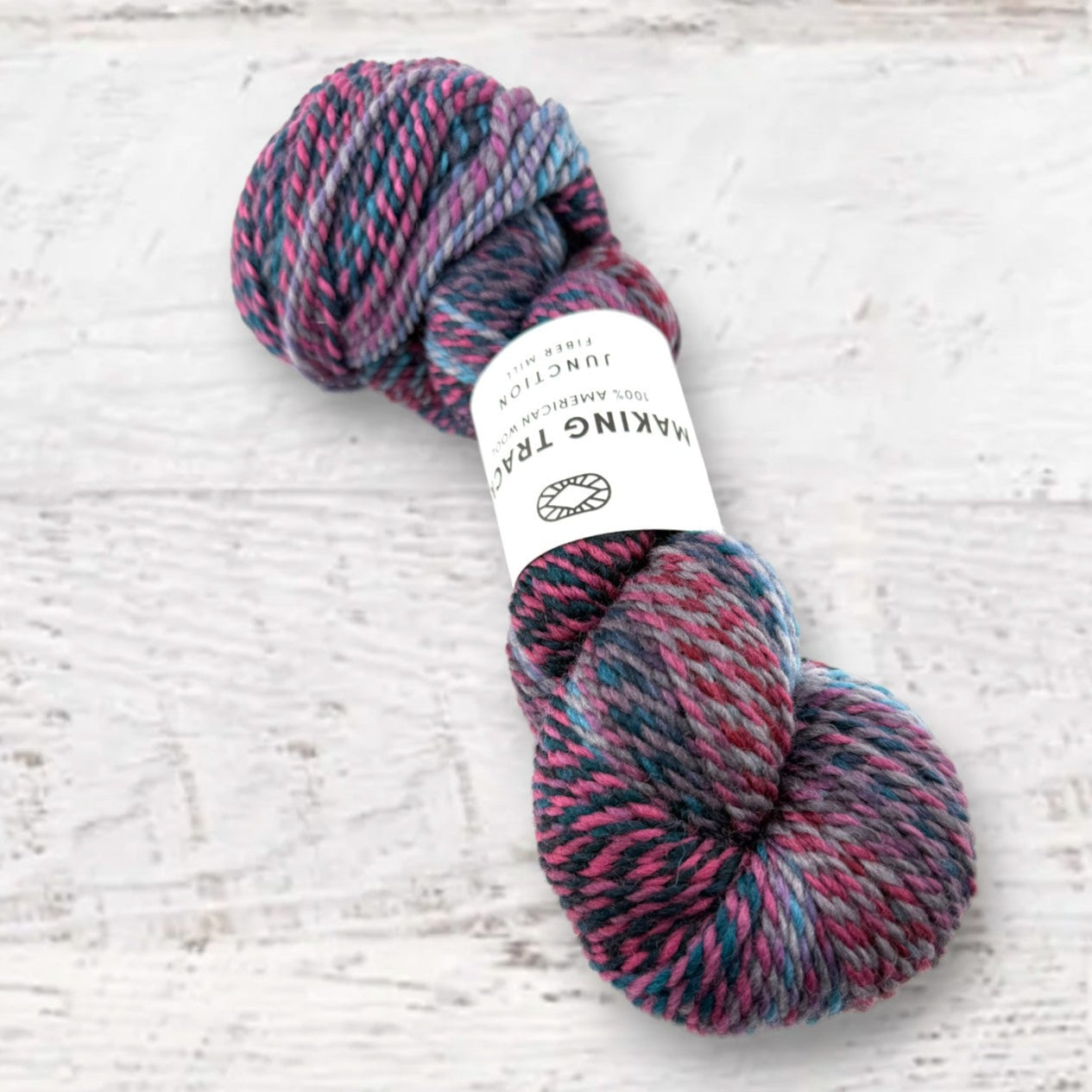 Each skein is unique! There is a lot of variation within each batch of Making Tracks. This yarn is a variegated blend of fine Merino, Targhee, and Corriedale wool from flocks in Idaho to western South Dakota. Scoured and combed at Chargeurs, it is hand-dyed, pin-drafted, spun, and finished at our mill. Proudly 100% American-grown and produced, this non-superwashed, non-mulesed yarn pairs beautifully with solid colors like our Farm Fresh line for stunning colorwork or can be used on its own for gradual color shifts.