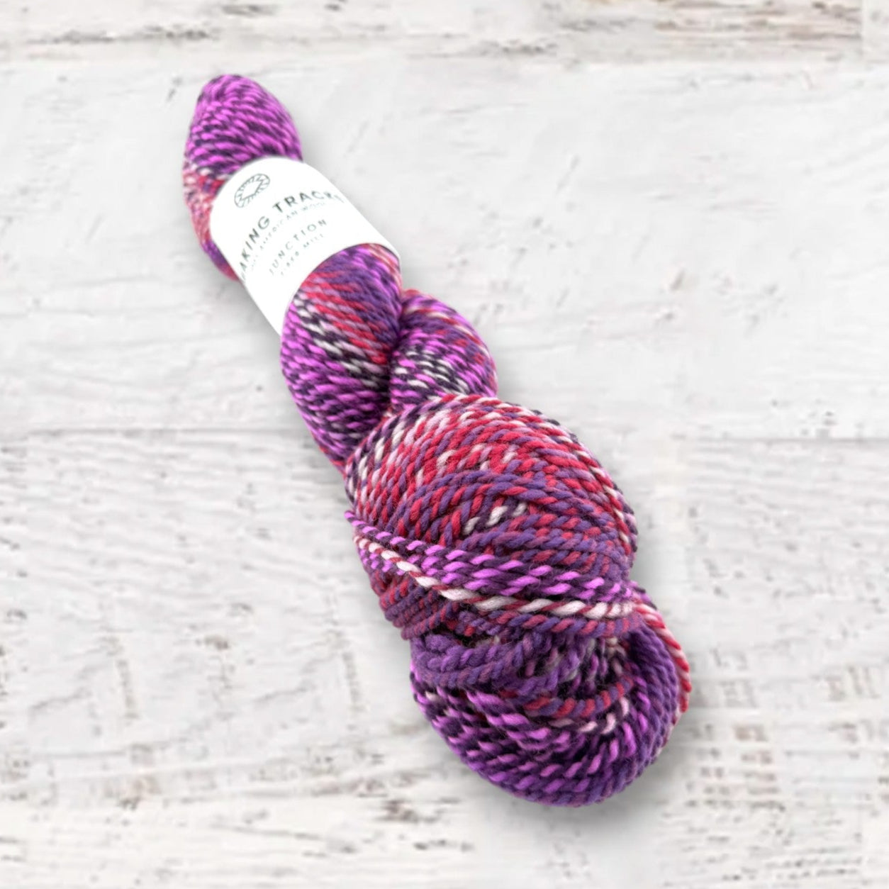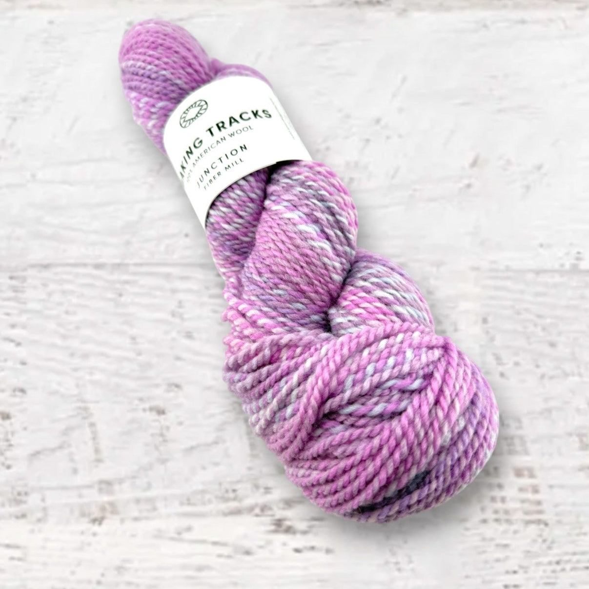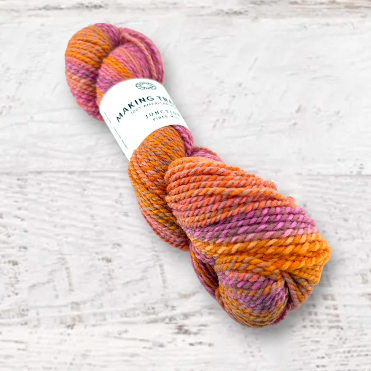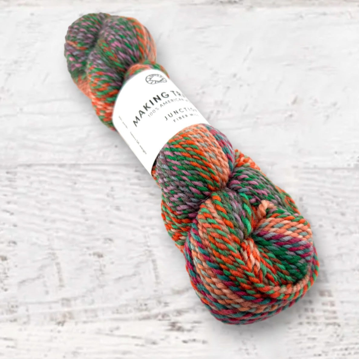 Each skein is unique! There is a lot of variation within each batch of Making Tracks. This yarn is a variegated blend of fine Merino, Targhee, and Corriedale wool from flocks in Idaho to western South Dakota. Scoured and combed at Chargeurs, it is hand-dyed, pin-drafted, spun, and finished at our mill. Proudly 100% American-grown and produced, this non-superwashed, non-mulesed yarn pairs beautifully with solid colors like our Farm Fresh line for stunning colorwork or can be used on its own for gradual color shifts.