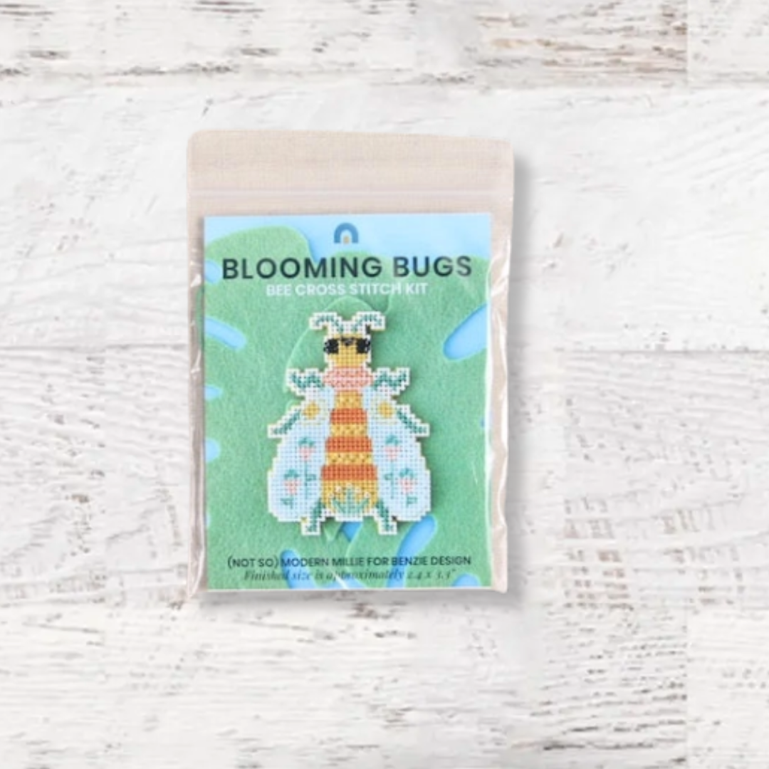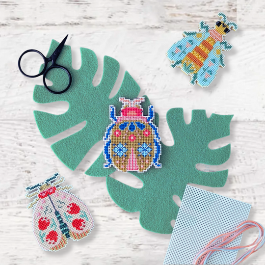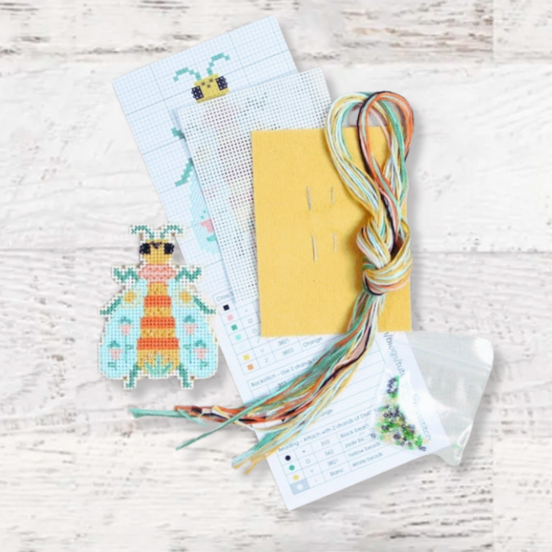 Blooming Bugs Cross Stitch Kit series includes a Bee, Moth, and Beetle, all adorned with flowers and accented with sparkly beads. Make a patch that you can add to a jeans jacket! We show all three here, from top to bottom:  Bee, Beetle, Moth; your order is for one.