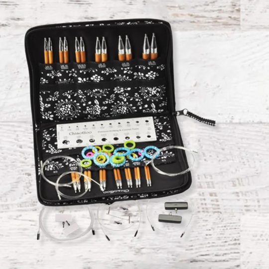 ChiaoGoo Interchangeable Needle Sets makes it easy to have the right needle on hand with these polished bamboo interchangeable needles.  Crafted from sustainable Moso bamboo each needle is printed with the needle size & has a smooth, snag-free finish.  Needles have swivel action to spin on cord for more effortless knitting.  The memory-free cords screw into the needle couplings seamlessly & a tightening key ensures that needles stay securely attached.