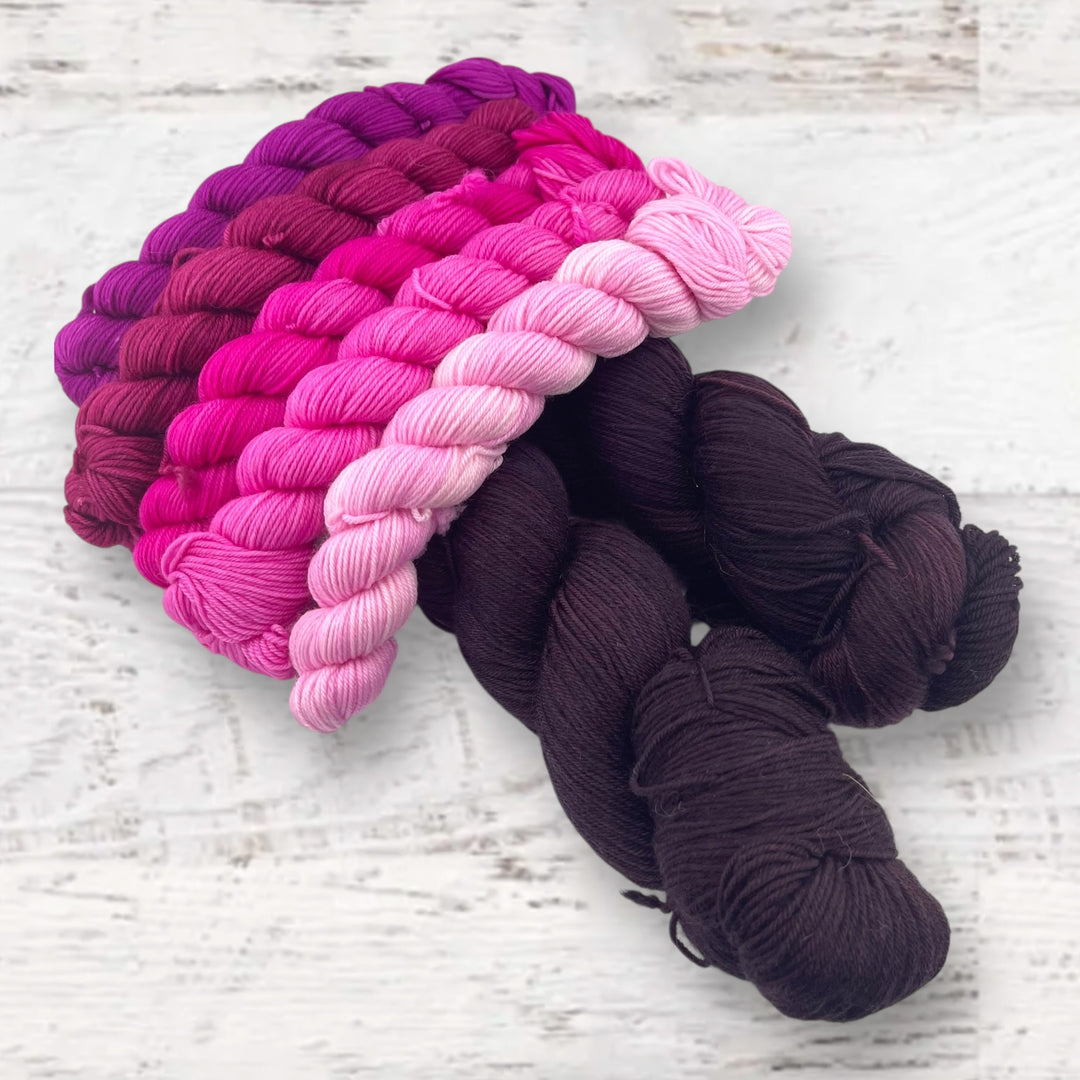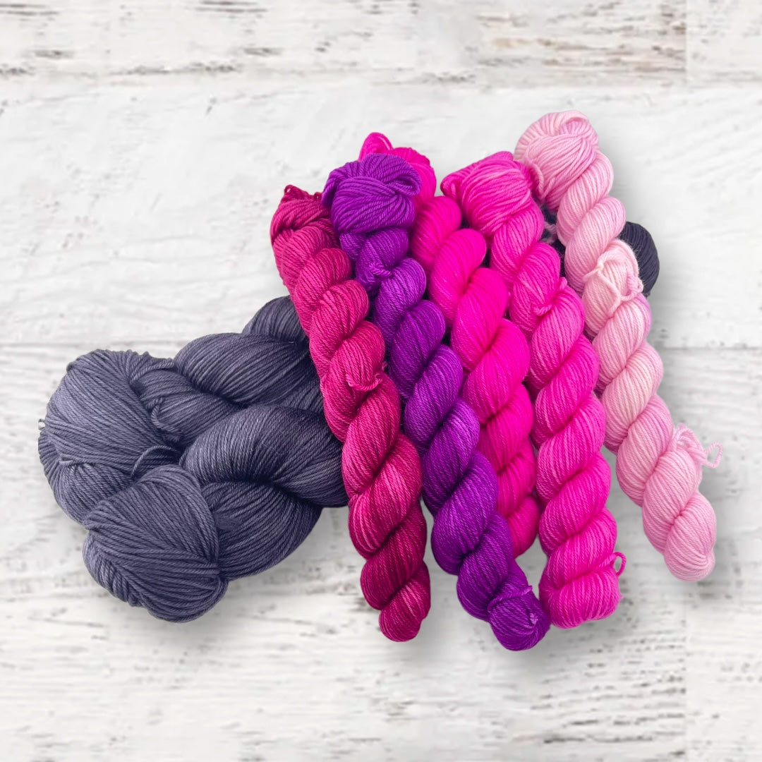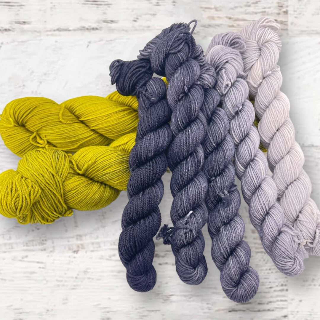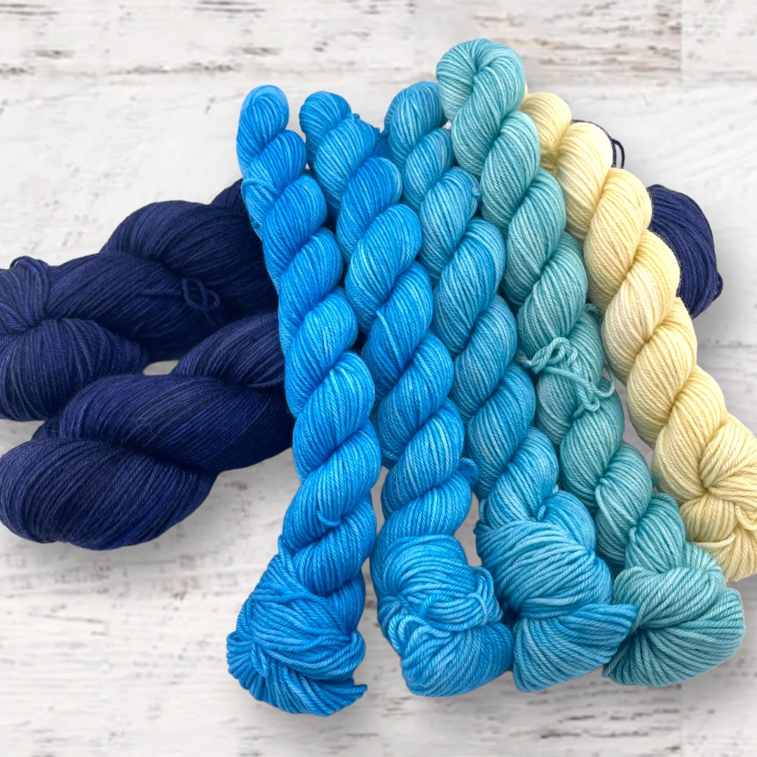 Kit includes one set of mini skeins and 2 full skeins of Keenan Hand Dyed Yarn (you will have enough for the split hem, and will have extra).
