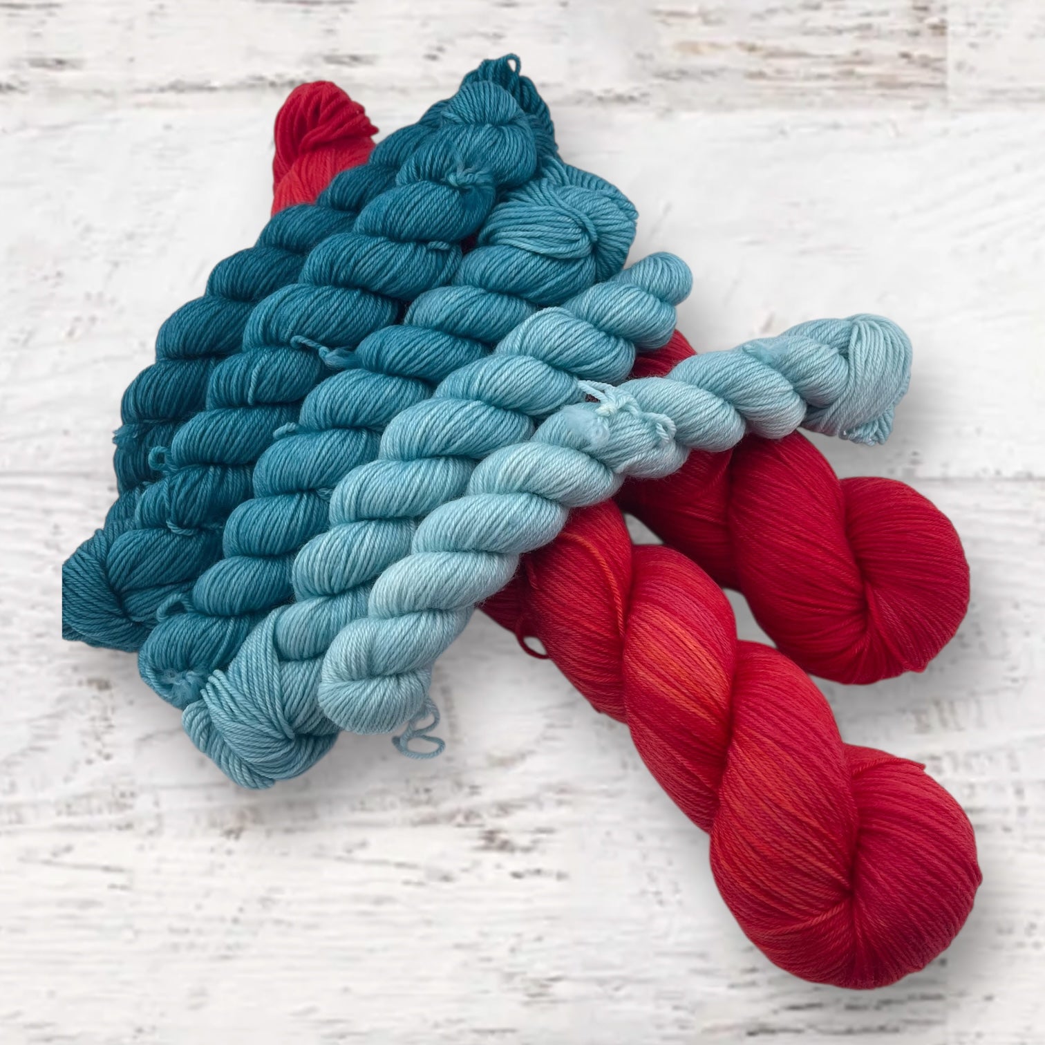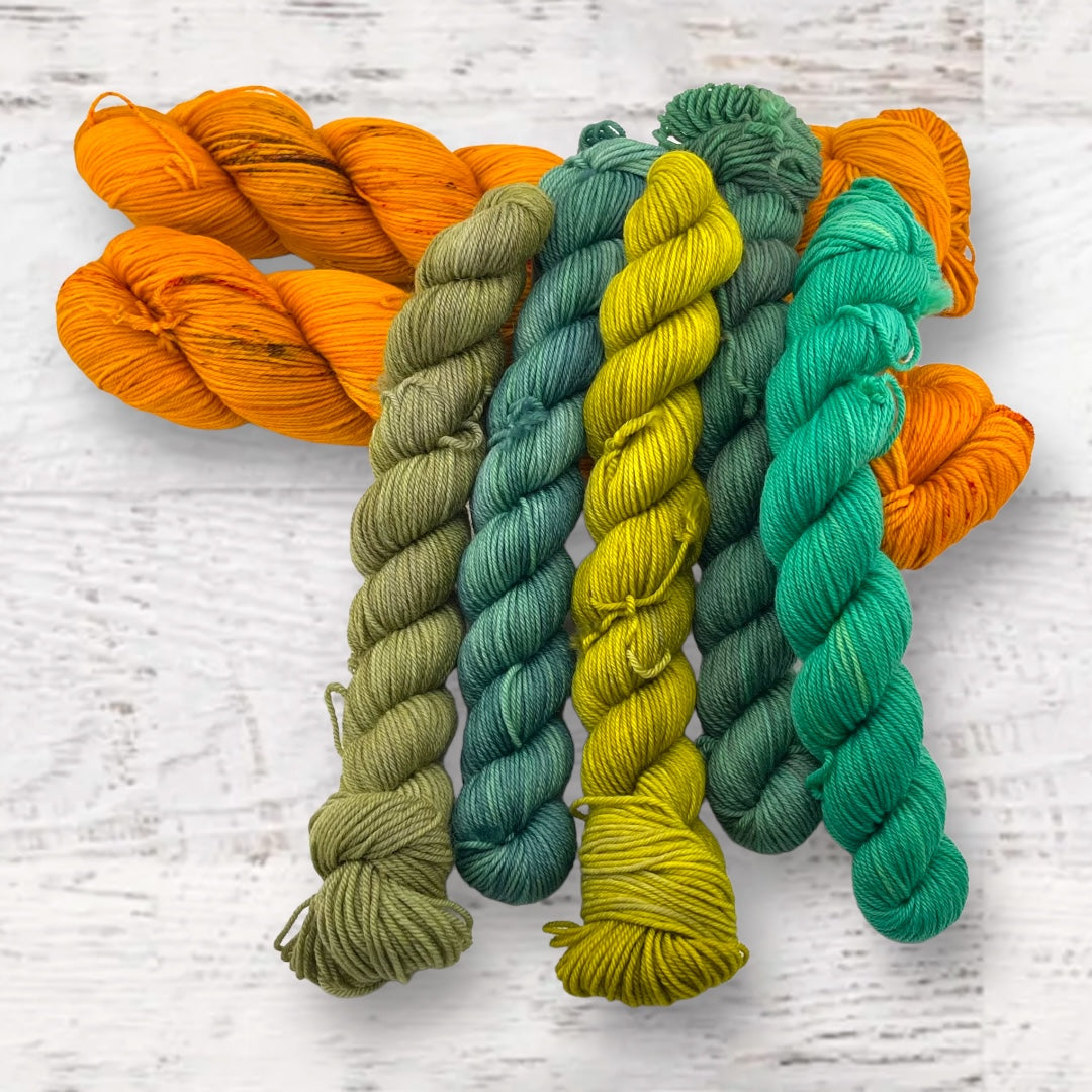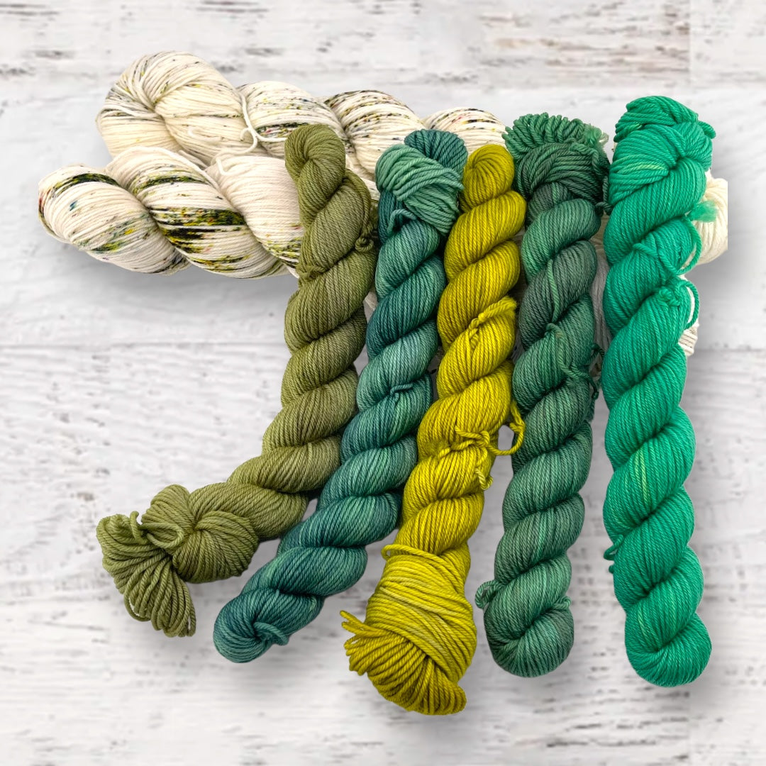 Kit includes one set of mini skeins and 2 full skeins of Keenan Hand Dyed Yarn (you will have enough for the split hem, and will have extra).