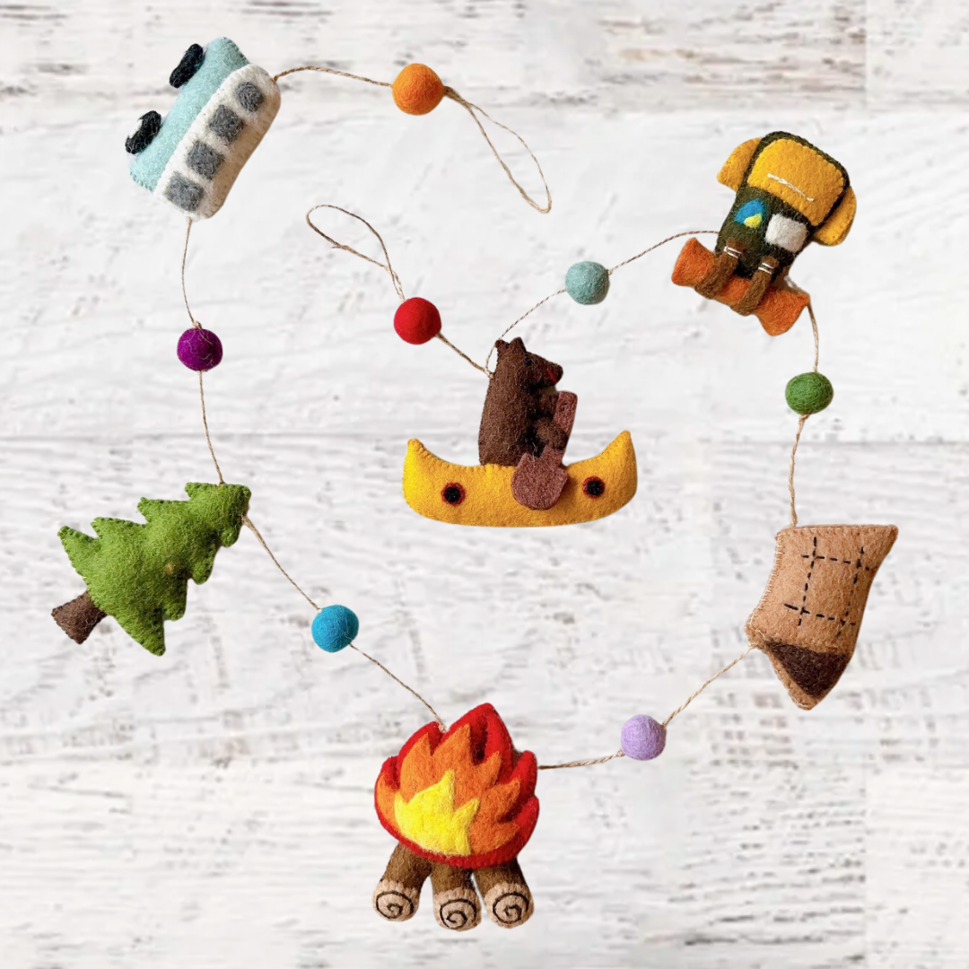 Camping Garland: Featuring a charming blue mini van, a sturdy tree, a cozy campfire, a classic tent, a trusty backpack, a bear-adorned kayak, and more. Let this garland ignite memories of outdoor escapades and the thrill of the wild, bringing the essence of camping right into your space. 🚐🌲🔥🐻, 4' long