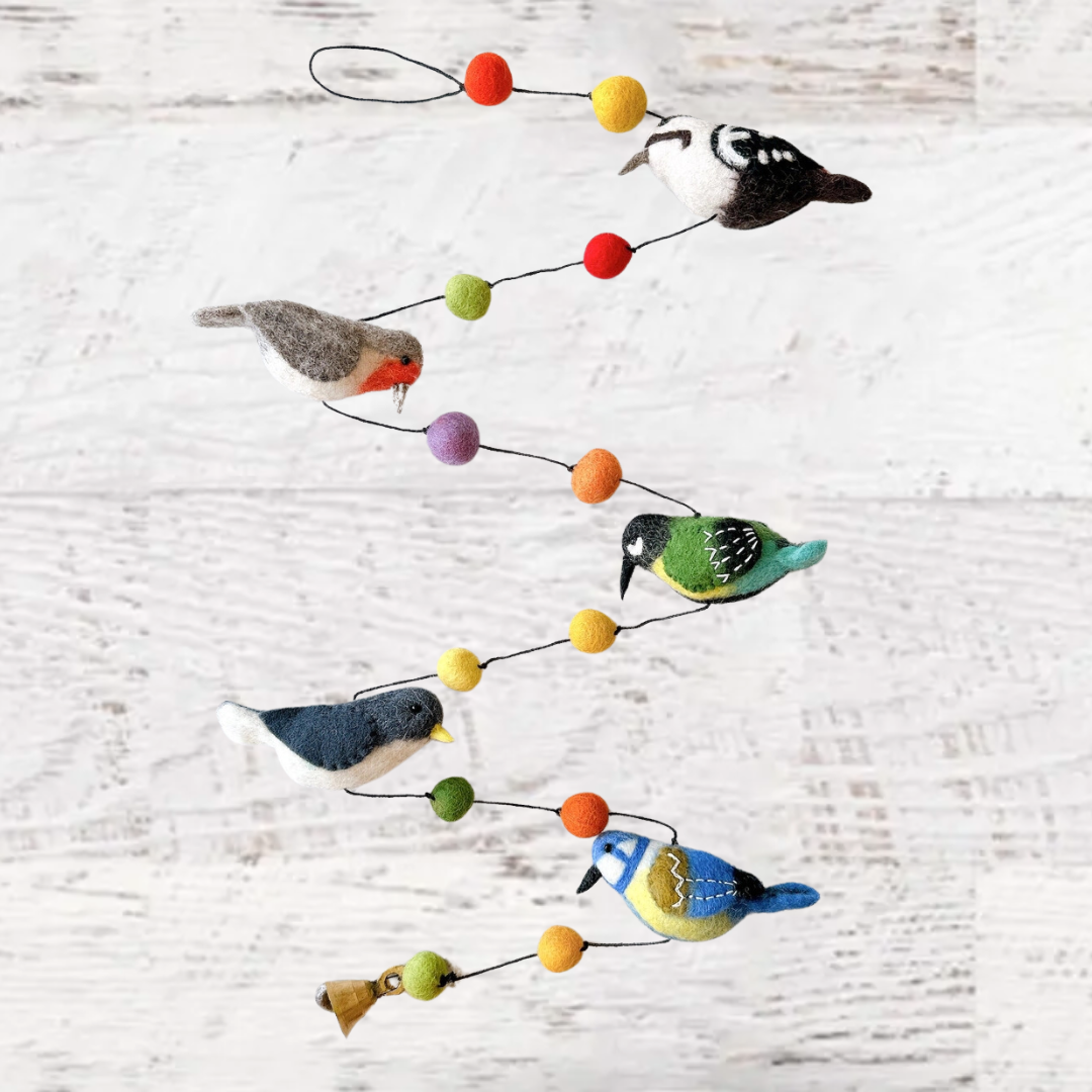 Bird Garland: needle felted, and 3D designed. The garland is about 4' long and consists of 5 felted birds, and with a bell at the end. It looks great from any angle.