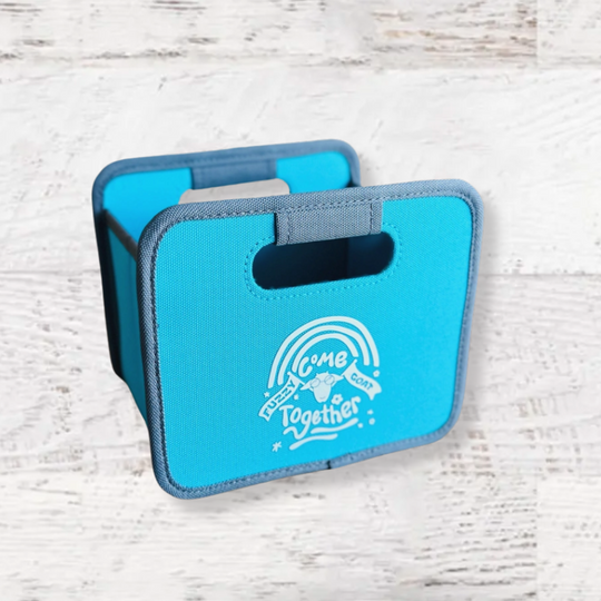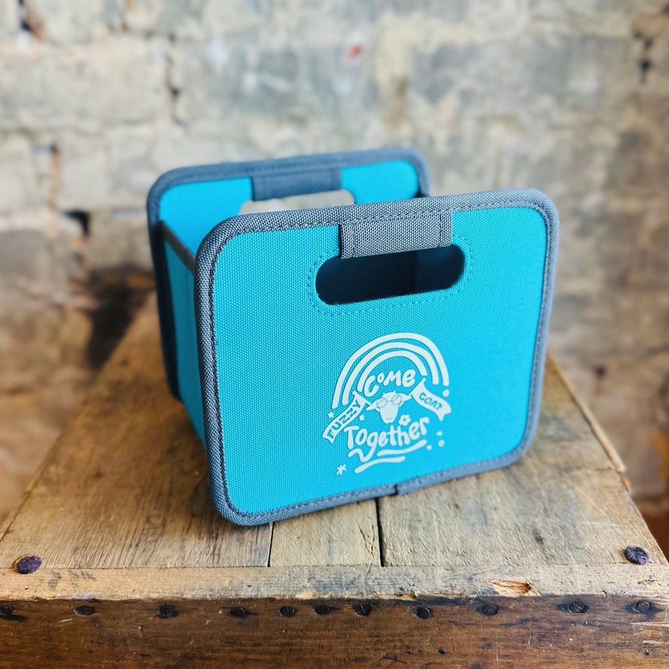 Our very own custom Folding Yarn Box folds & unfolds in three quick steps; when open, it's a stable, sturdy yarn box, when closed it is flat and easy to tuck into your project bag. It has one compartment with an elastic mesh interior pocket and handles (nothing to snag your yarn).