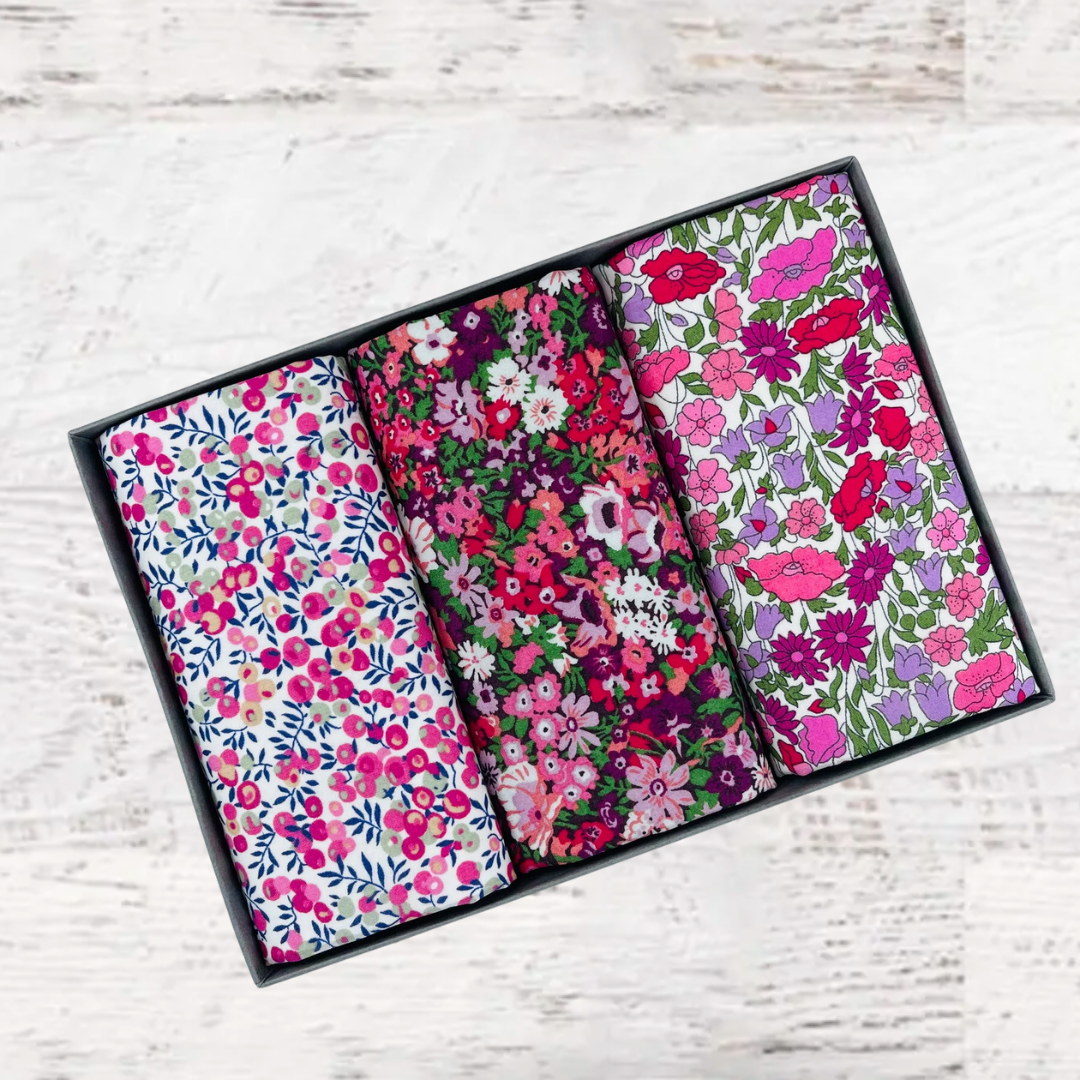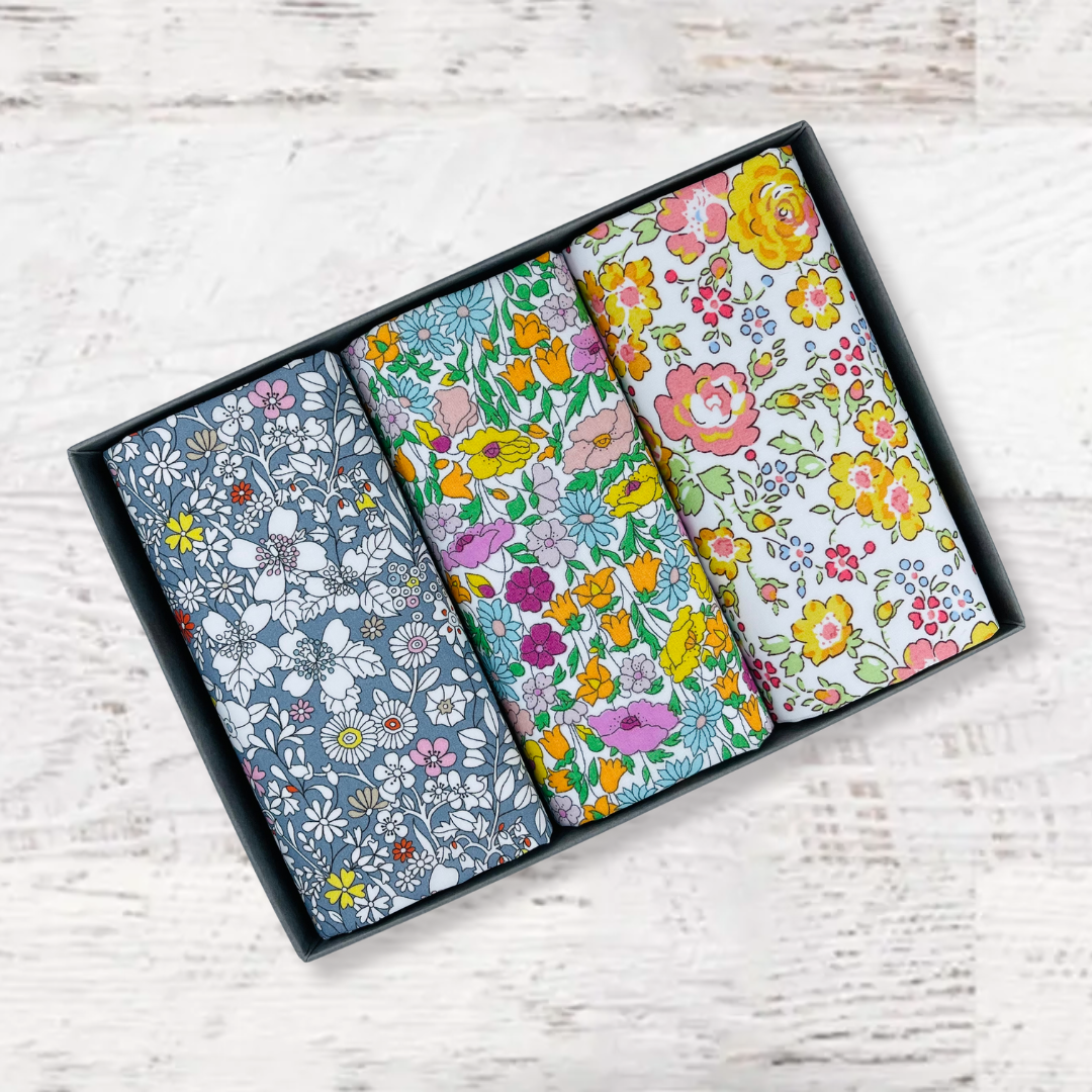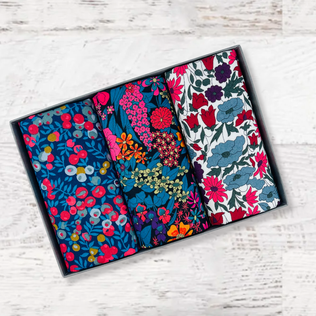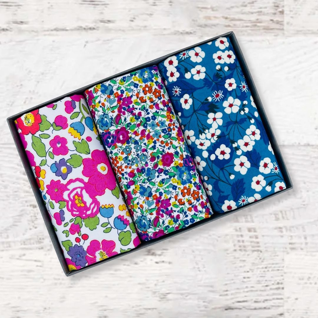 Beautifully packed in a set of three. Liberty of London Tana Lawn™ cotton is printed in the Liberty Printing Mill, located between Milan and Lake Como in northern Italy, Tana has a silk-like touch, unique print quality and striking color vibrancy. Hand trimmed in the UK. Ideal for weddings and groomsmen, Mother of the bride, Aunties or just as a present for someone special.