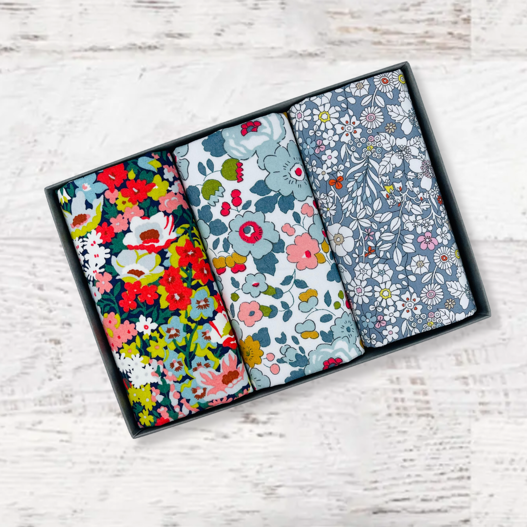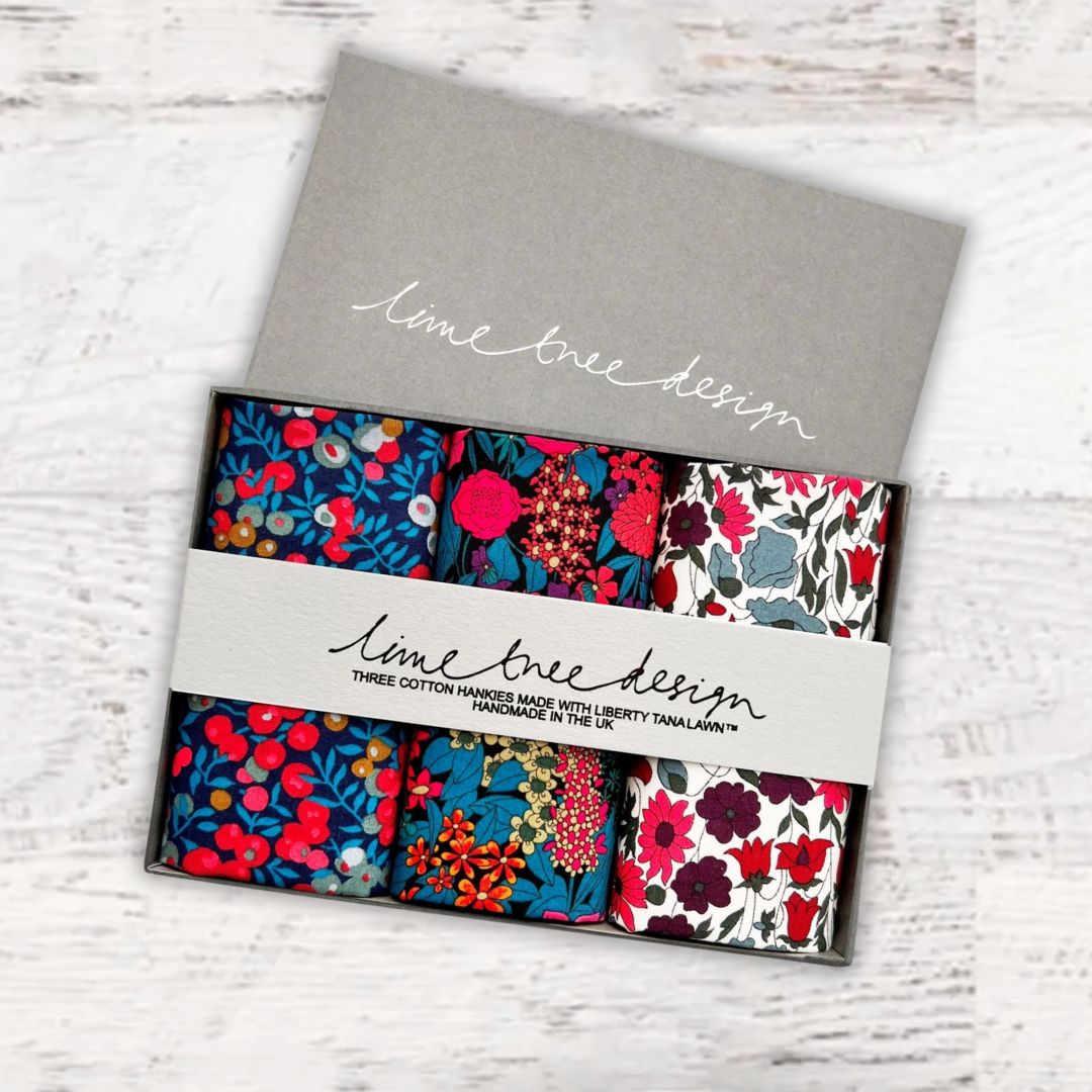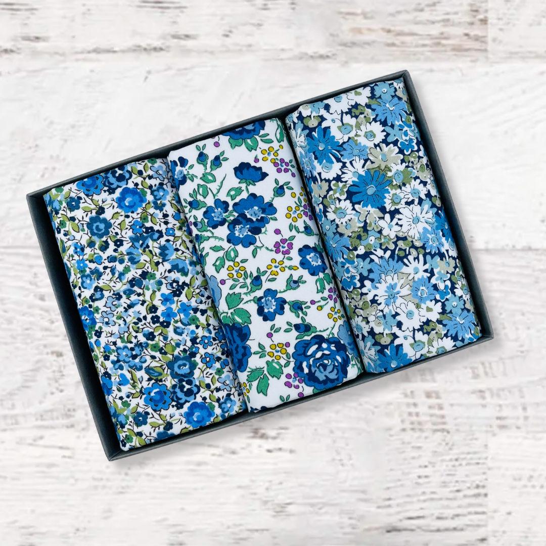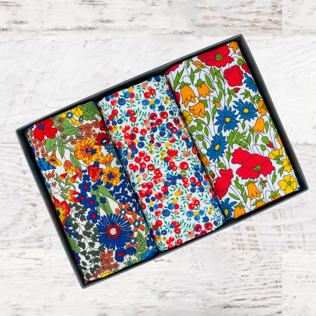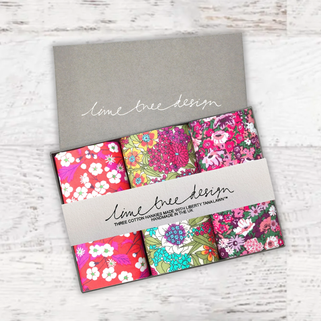 Beautifully packed in a set of three. Liberty of London Tana Lawn™ cotton is printed in the Liberty Printing Mill, located between Milan and Lake Como in northern Italy, Tana has a silk-like touch, unique print quality and striking color vibrancy. Hand trimmed in the UK. Ideal for weddings and groomsmen, Mother of the bride, Aunties or just as a present for someone special.