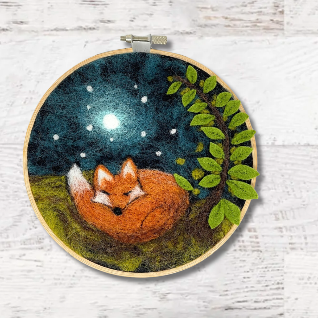 sleepy fox, bee, otters or hedgehog in a hoop 'painting with wool' by following the clear photographic instructions and using the UK-sourced materials included. Suitable for beginners, ages 10+ - includes 15cm embroidery hoop, a recycled foam mat to work on, chalk, full-color instructions.