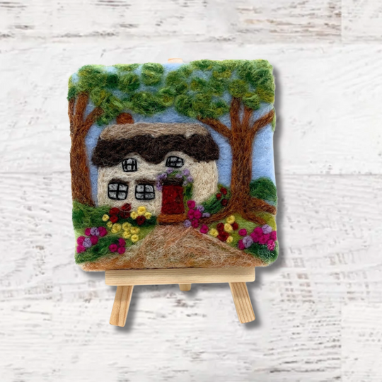mini masterpiece cottage 'painting with wool' and make your own mini masterpiece of a sweet little cosy white cottage with a charming thatched roof. Suitable for beginners, ages 10+, finished size 10x10cm, includes, mini easel with stand, recycled foam mat, full-color instructions.