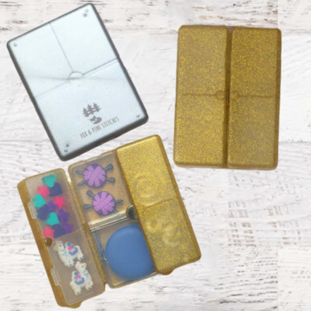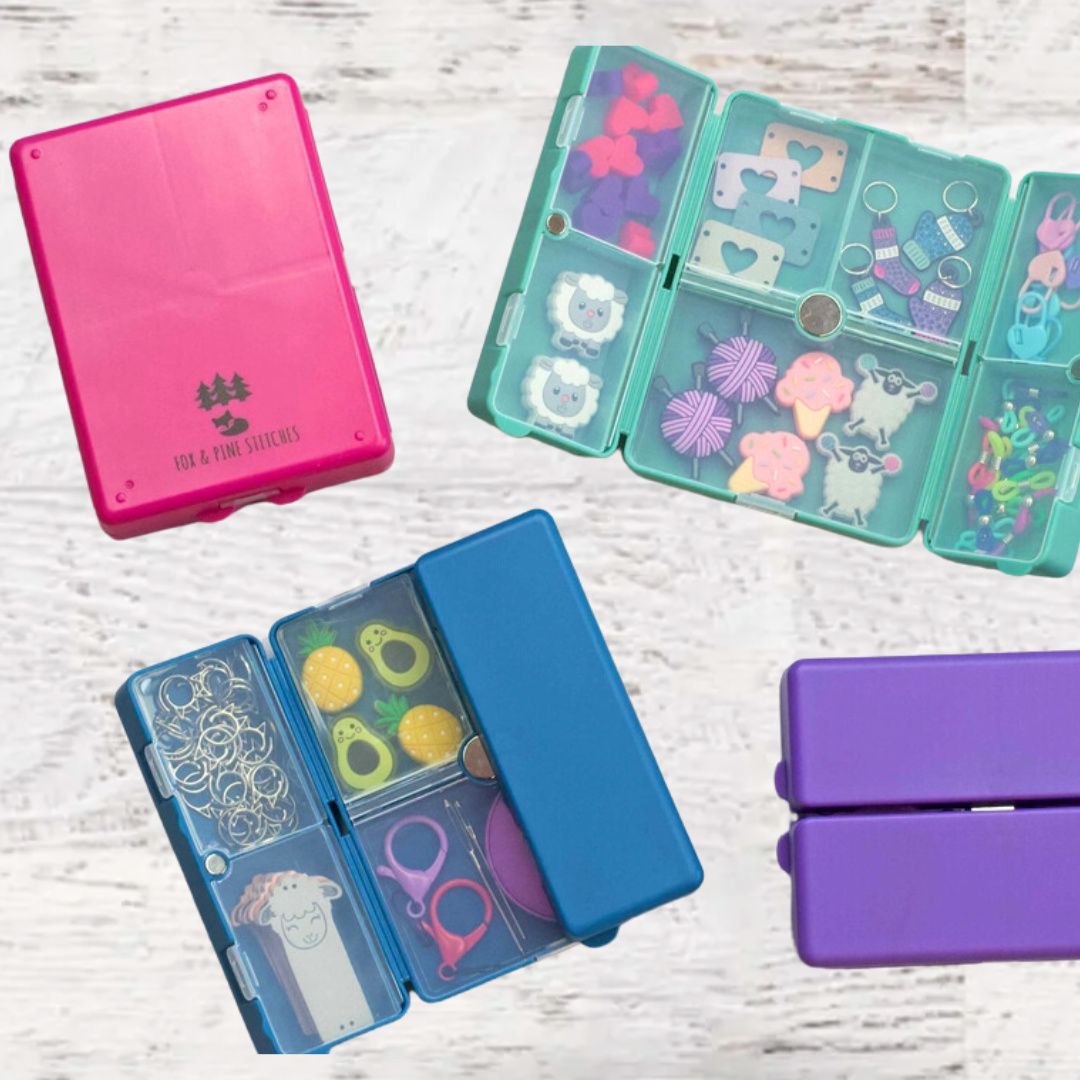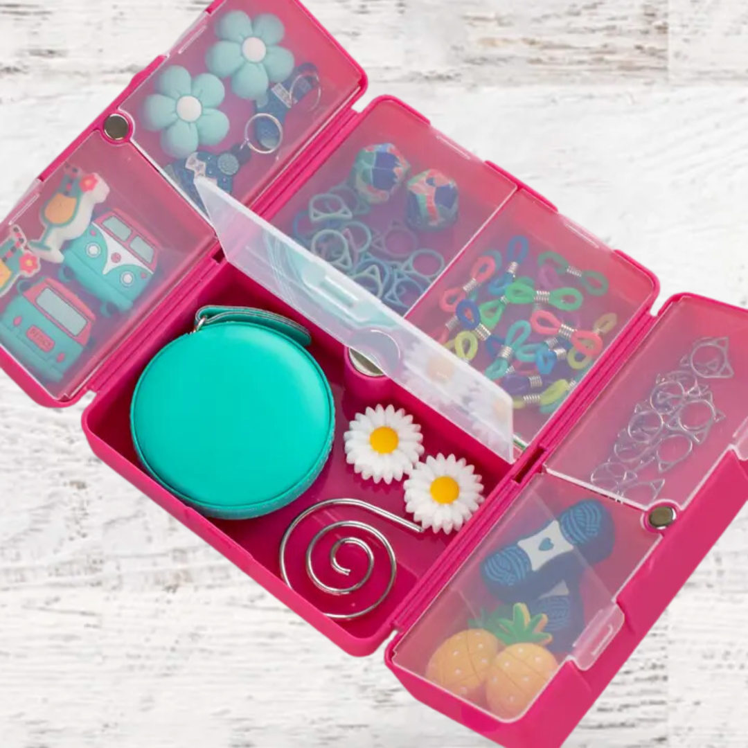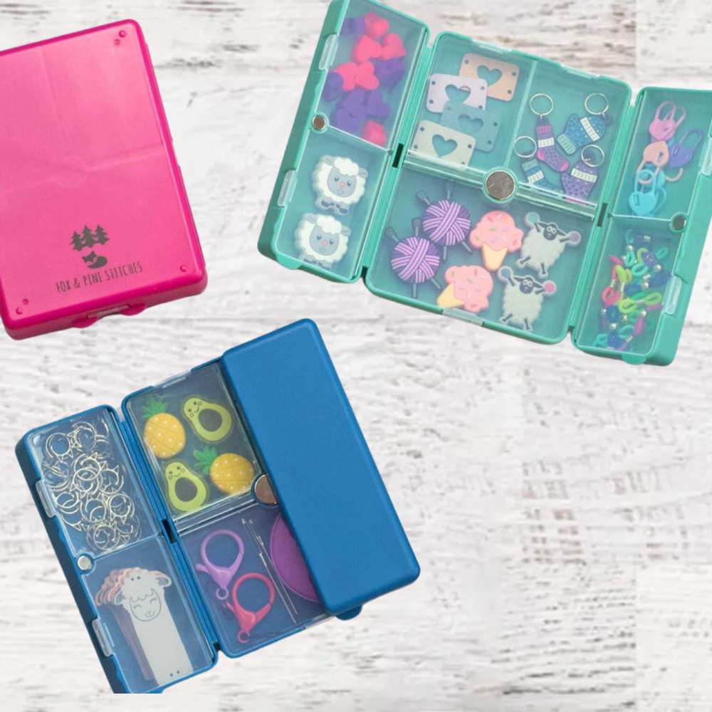 Tara's Notion Nooks are the ultimate on-the-go notion organizer. You'll never want to leave home without it! Store and proudly display all of your stitch stoppers, notions and tools in our portable & durable hard plastic containers. Perfect to throw in your project bag and take with you wherever your craft projects go. Our high quality cases have transparent flaps for each compartment so you can see your collection of notions while keeping them organized in separate sections. The cases close securely with a strong magnet.