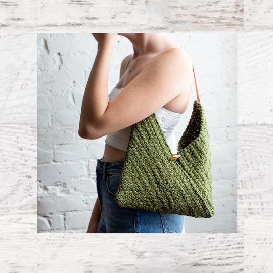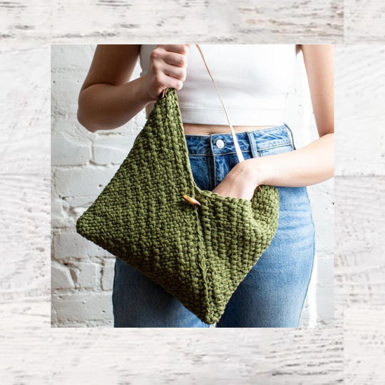 Knit this gorgeous bag in only a few hours. The chunky texture of the twill tape adds stunning visual interest, while the shape is functional and fun at the same time. Add a lovely, removable leather handle, along with a one-of-a-kind antique toggle button to keep your bag closed. The Tessa Tote is worked in the Linen Stitch across a simple rectangle. Accomplish the shape through folding as a bento bag at the end of the project.