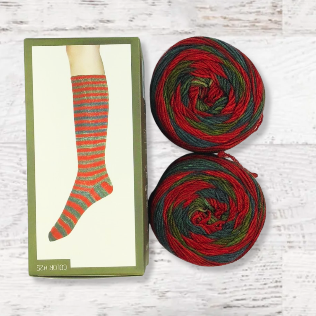 Enjoy matching socks with this self-striping sock kit with matching stripes. Kit contains 2 pre-wound identical cakes. (You may see a color at one end of the sock depicted, but you can swap which end of the ball to start with.) Urth yarns plant a tree in Africa for each skein purchased.